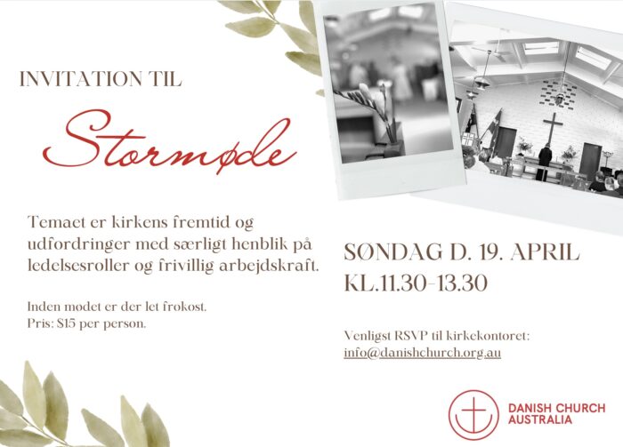 You are warmly invited to take part in our upcoming Town Hall Meeting, where we will focus on the future of the Danish Church in Sydney. The meeting will explore both challenges and opportunities, with particular attention to leadership roles and volunteer involvement.